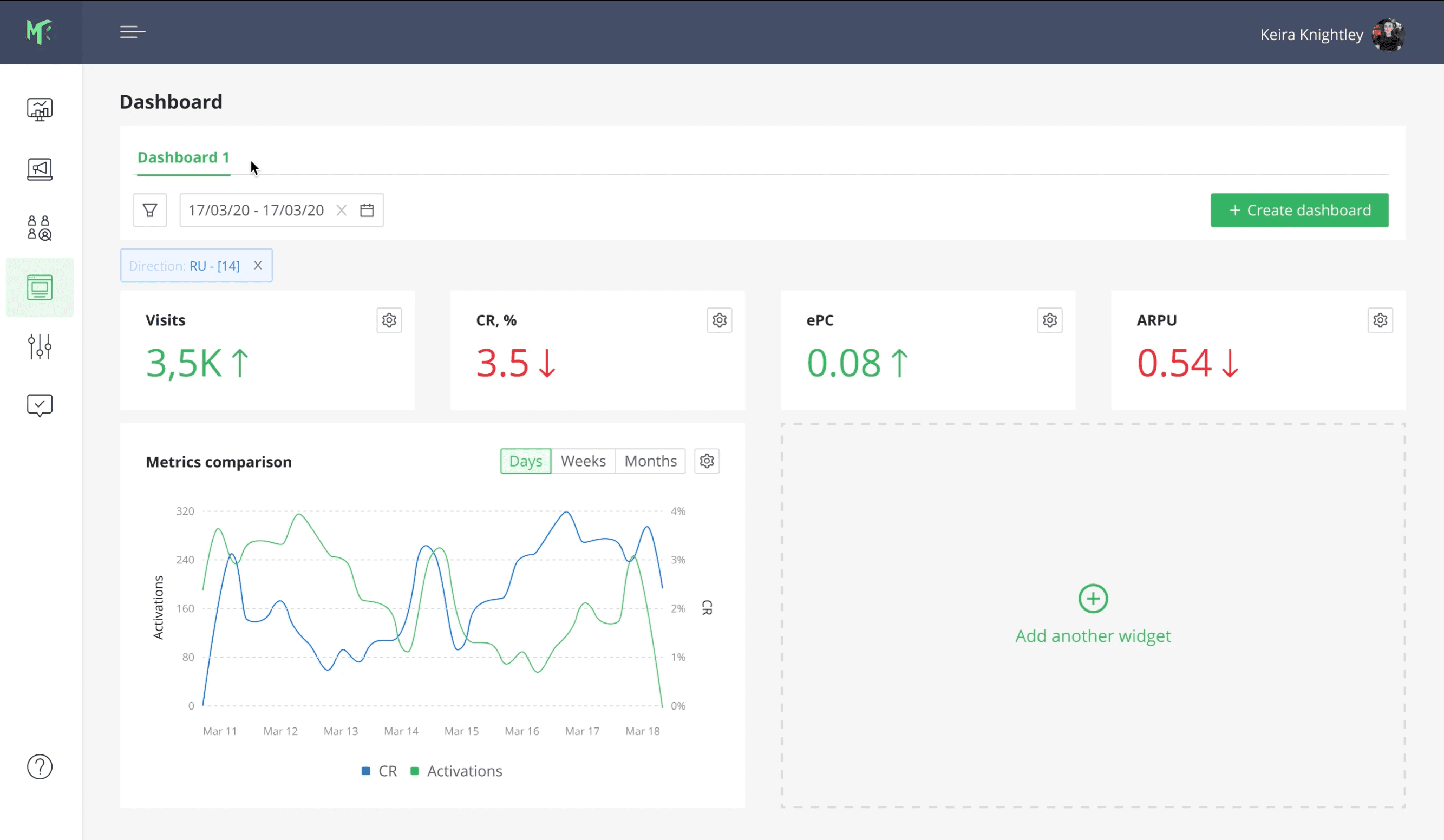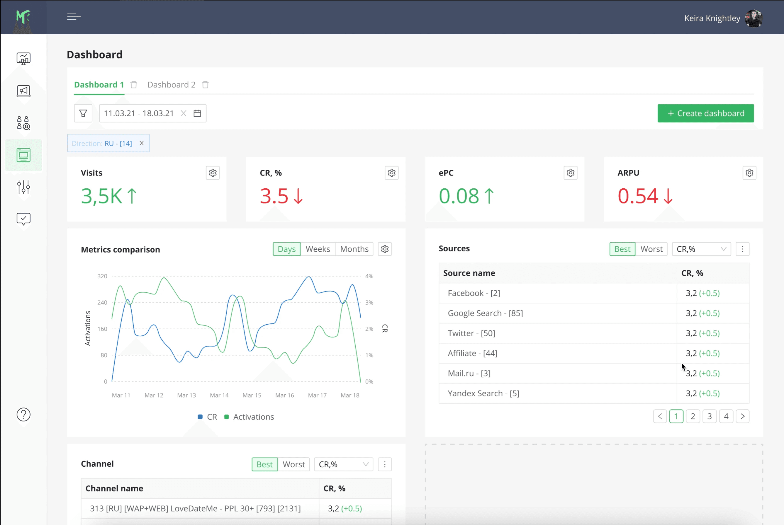 For instance, high-level metrics such as ROI would be placed in one tab, while lower-level metrics critical for sustaining ad campaign performance (CR, ePC, ARPU) would reside in another.